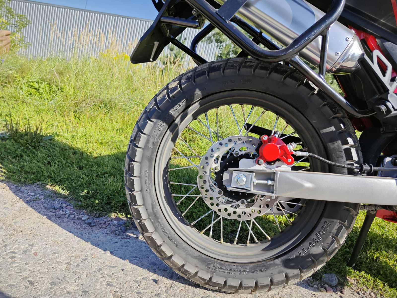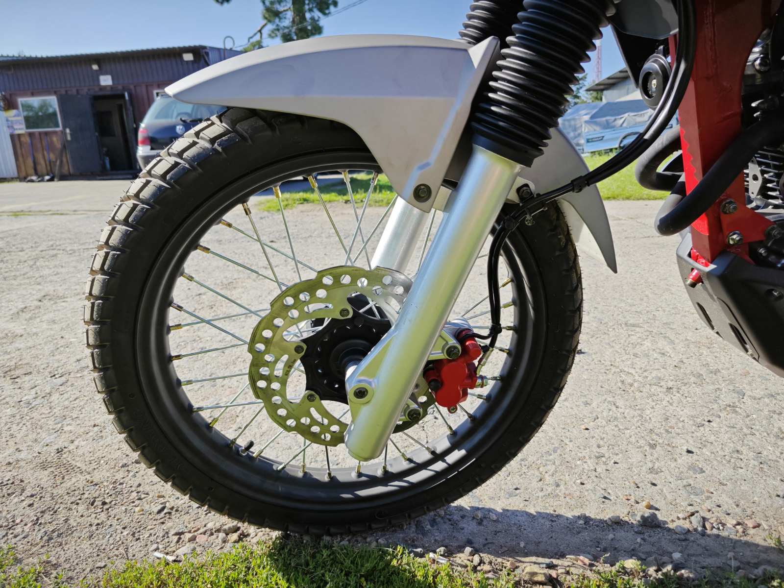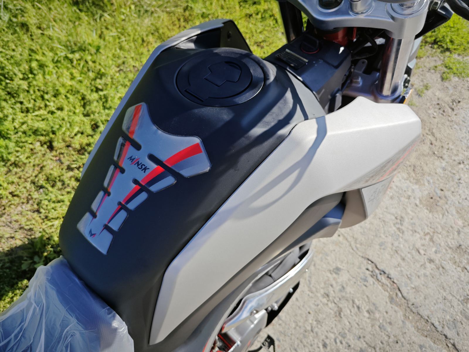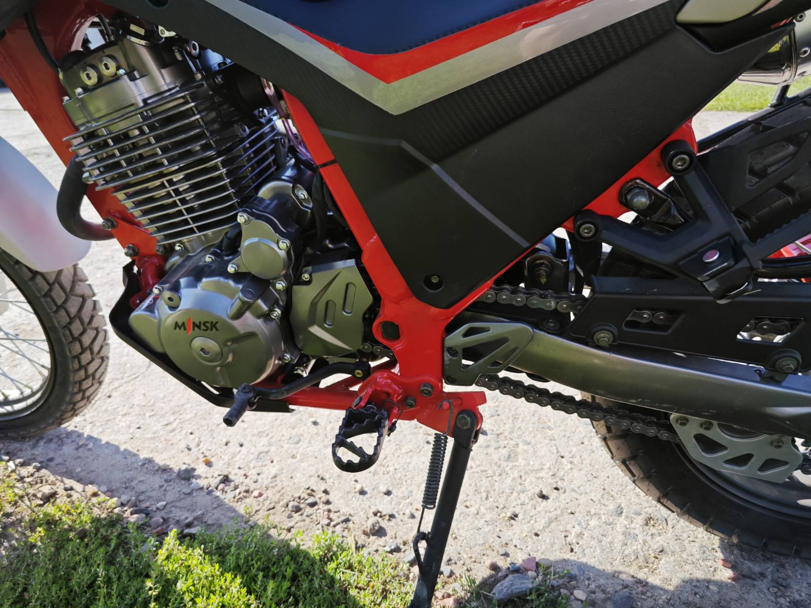 Объем топливного бака — 15 литров, выполнен из металла для надежности. Двигатель одноцилиндровый, четырехклапанный с двумя распредвалами, мощностью 27,3 л.с., крутящим моментом 32,5 Н/м при 5000 об/мин. Масляное охлаждение реализовано через переднюю часть рамы без радиатора. Материалы деталей обеспечивают долговечность и ремонтопригодность.
