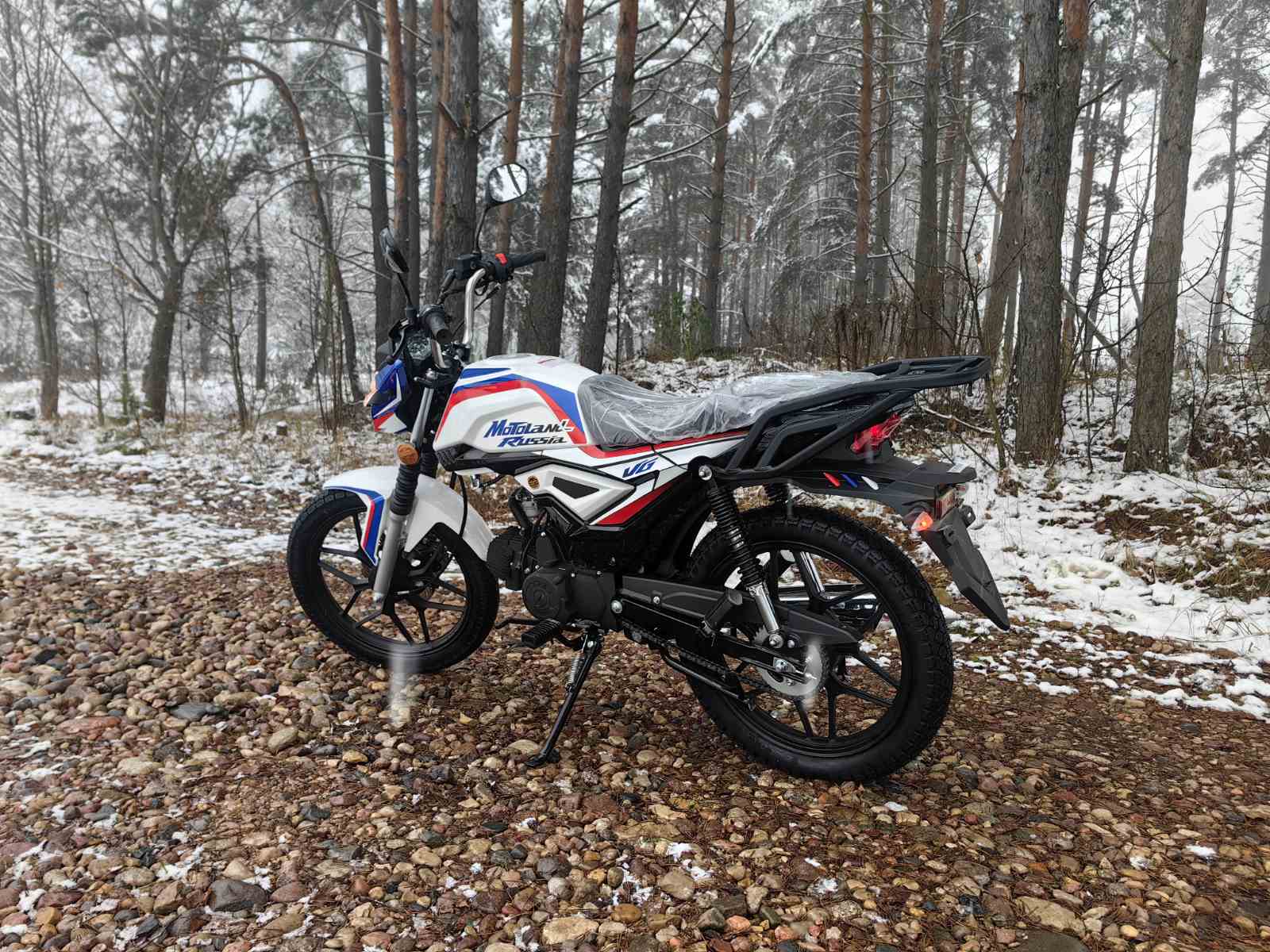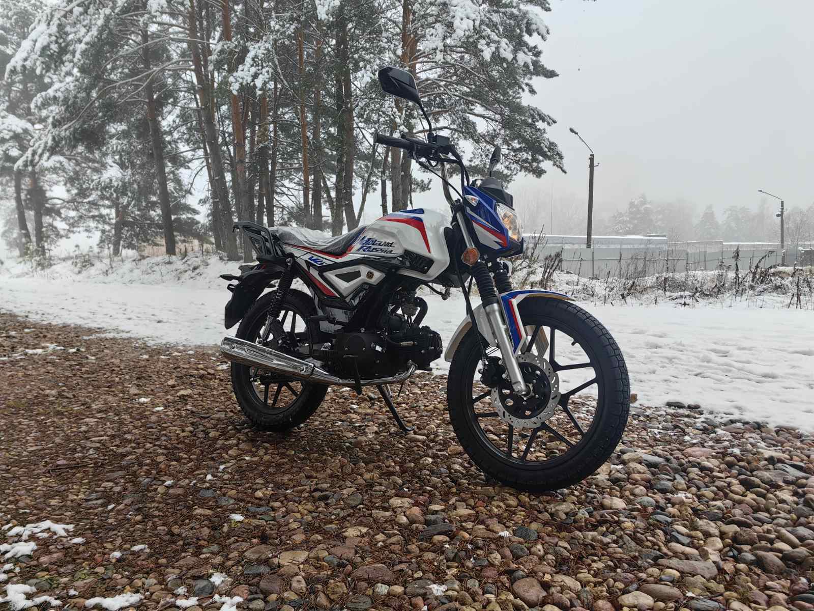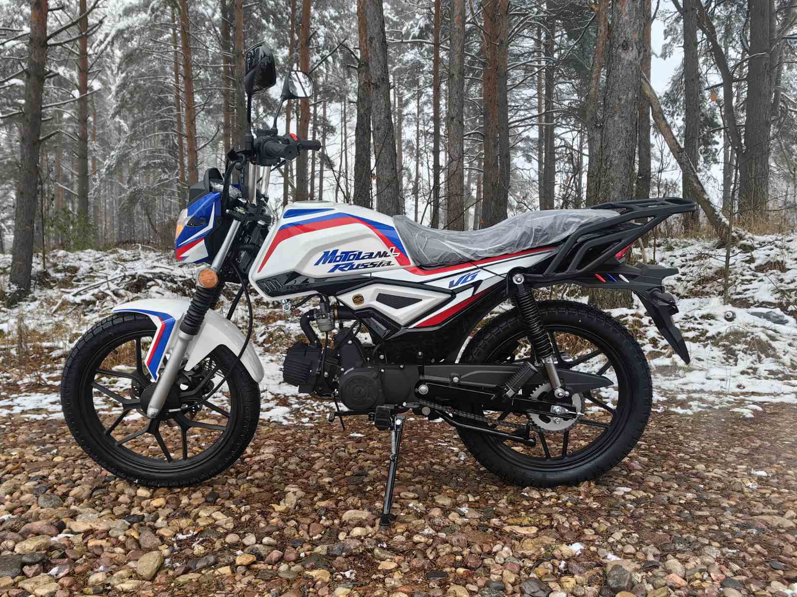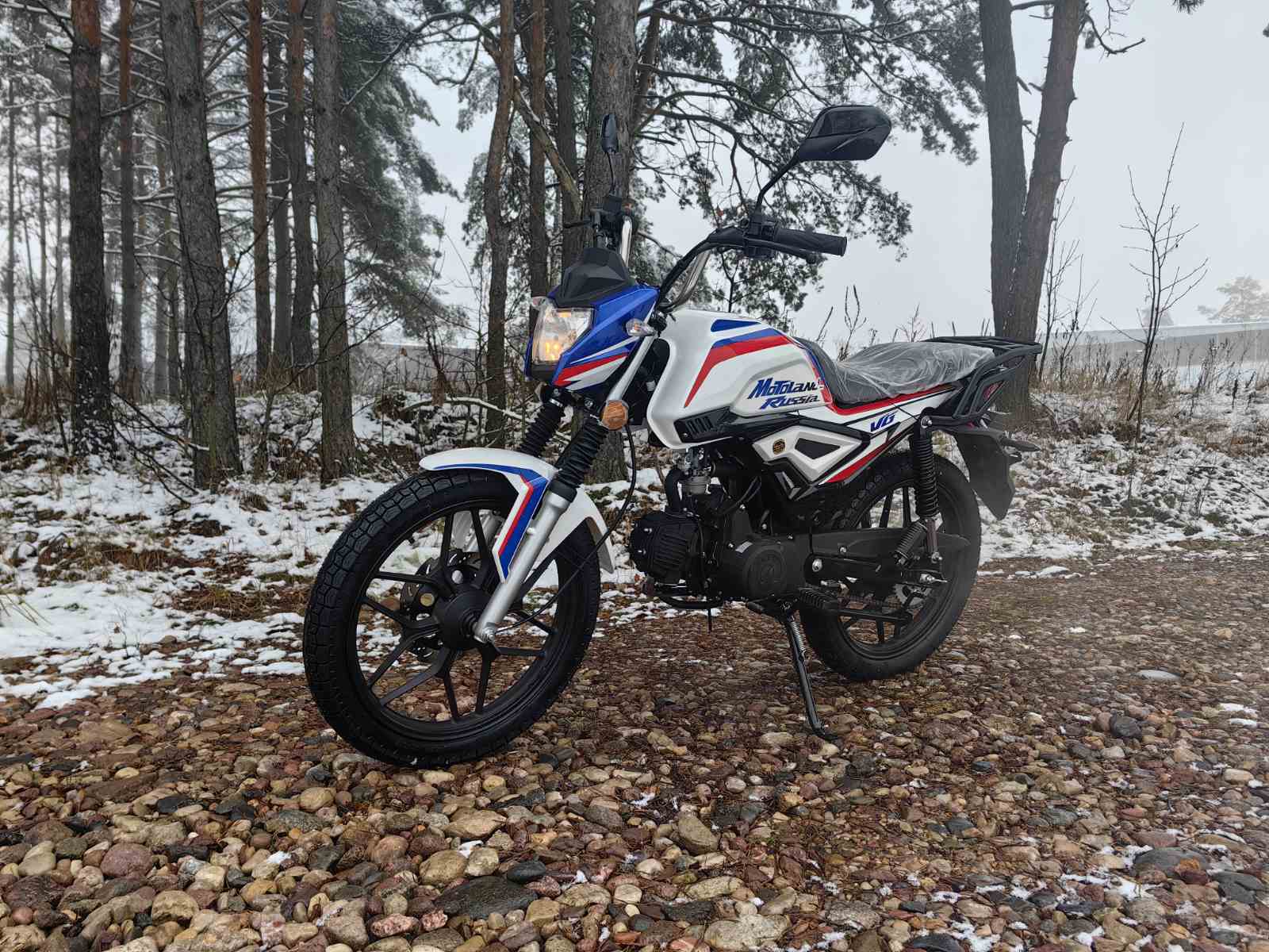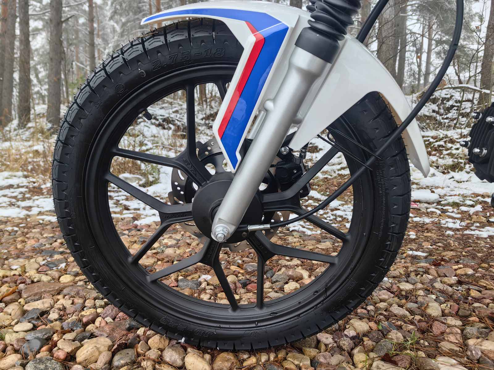 Колеса у мопеда Motoland Альфа VG 11 на литых дисках, 18 дюймов. Резина 2.75 спереди, 3.50 сзади. Это не скутерные 12-е и 13-е, а полноразмерные колеса. Они лучше держат колею, преодолевают ямы и не проваливаются в грунт.