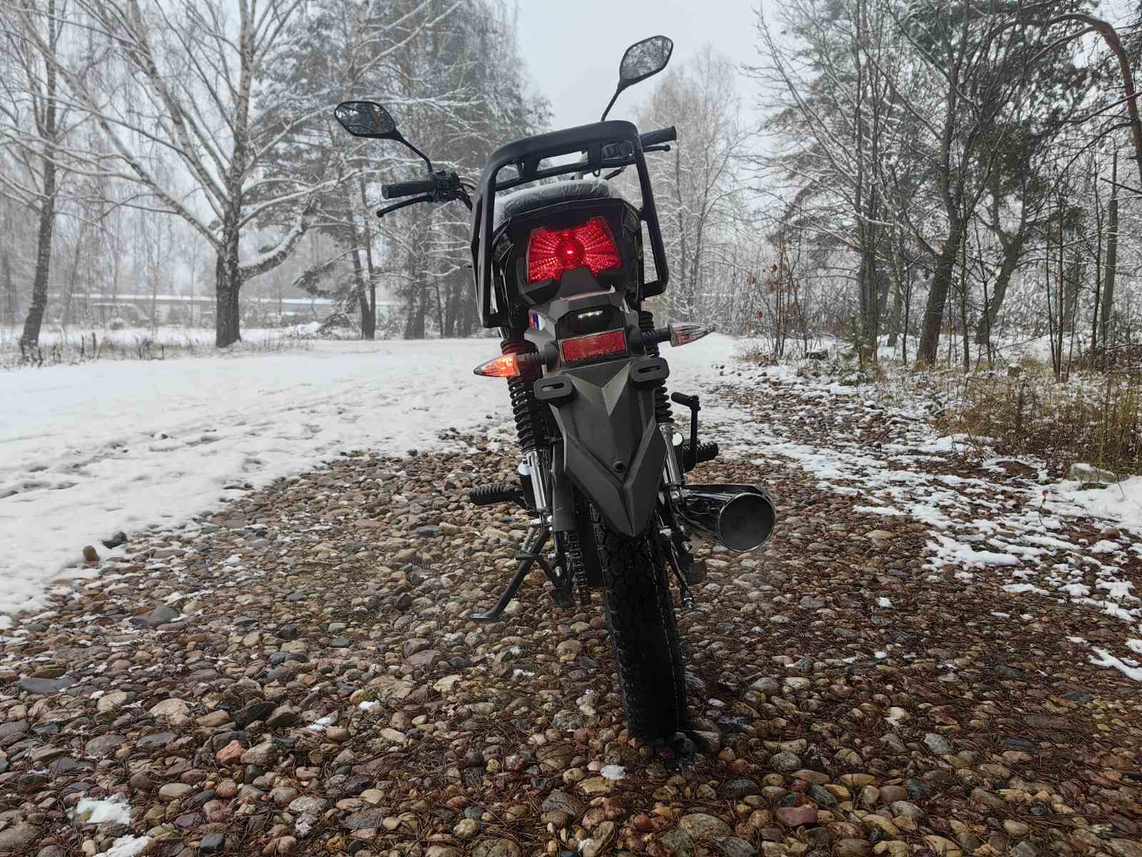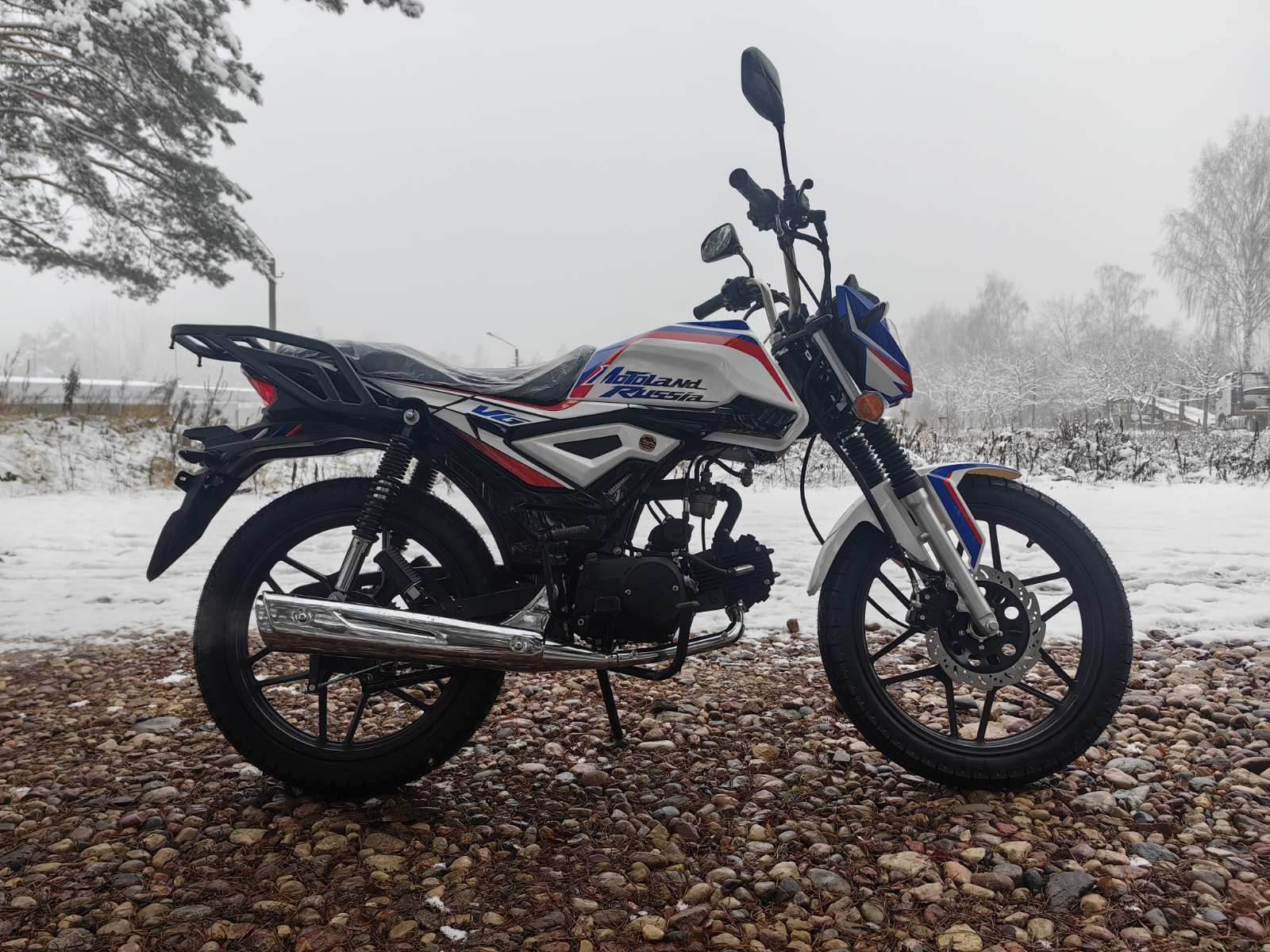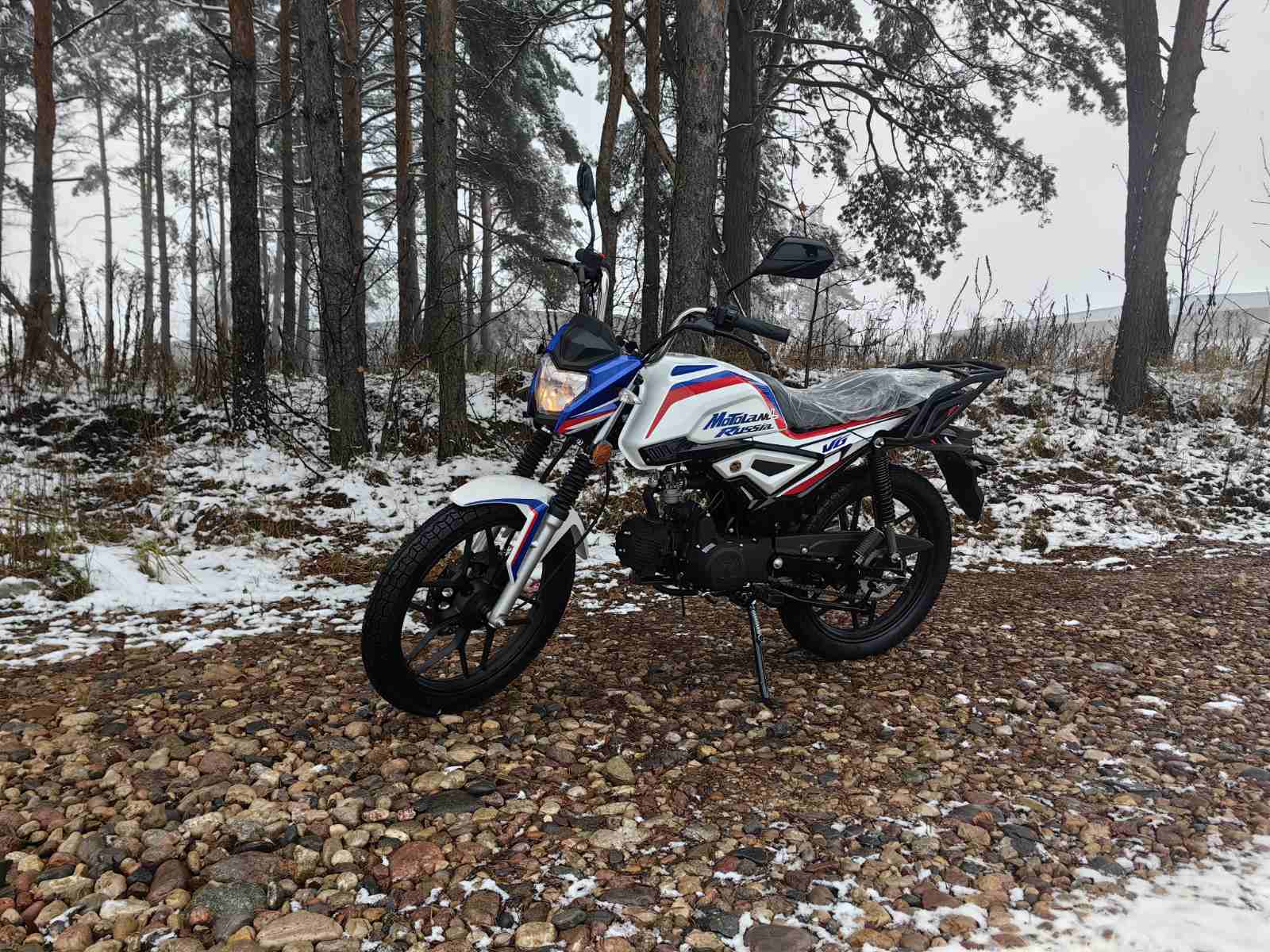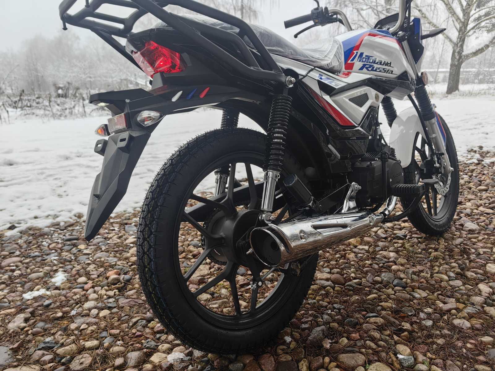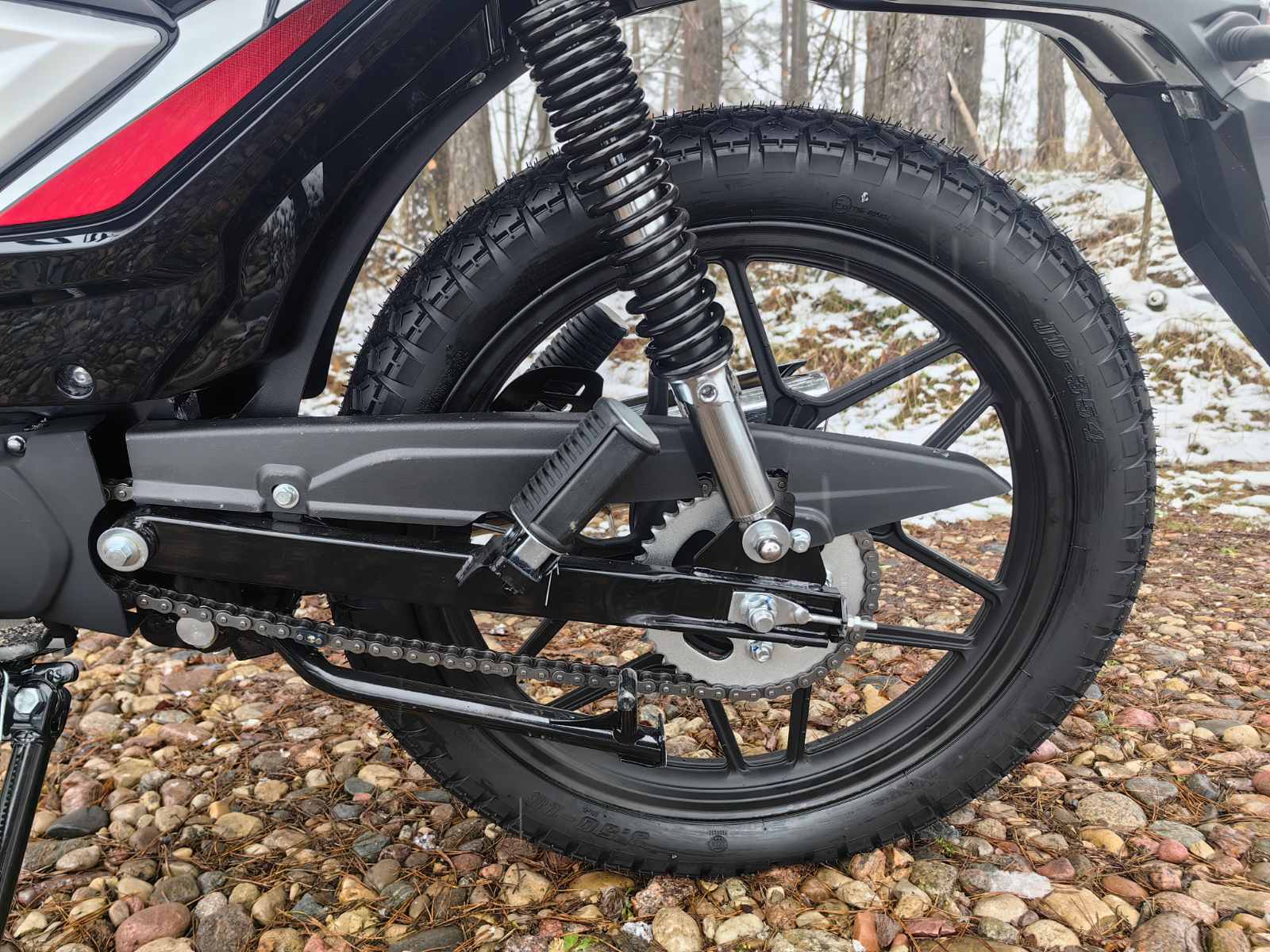 Колеса у мопеда Motoland Альфа VG 11 на литых дисках, 18 дюймов. Резина 2.75 спереди, 3.50 сзади. Это не скутерные 12-е и 13-е, а полноразмерные колеса. Они лучше держат колею, преодолевают ямы и не проваливаются в грунт.