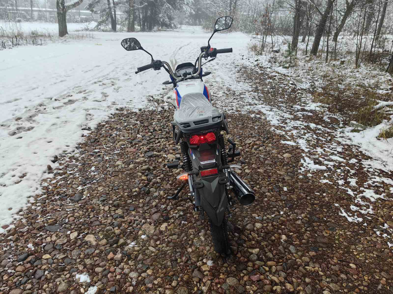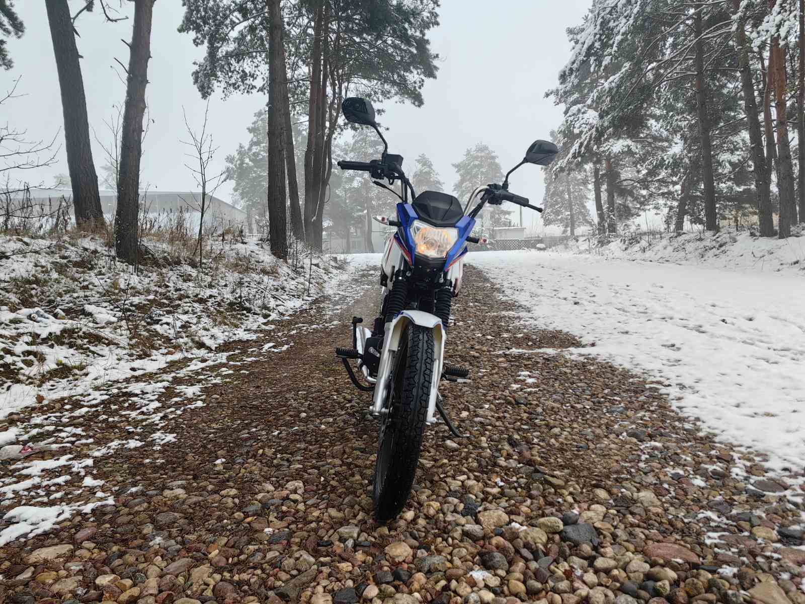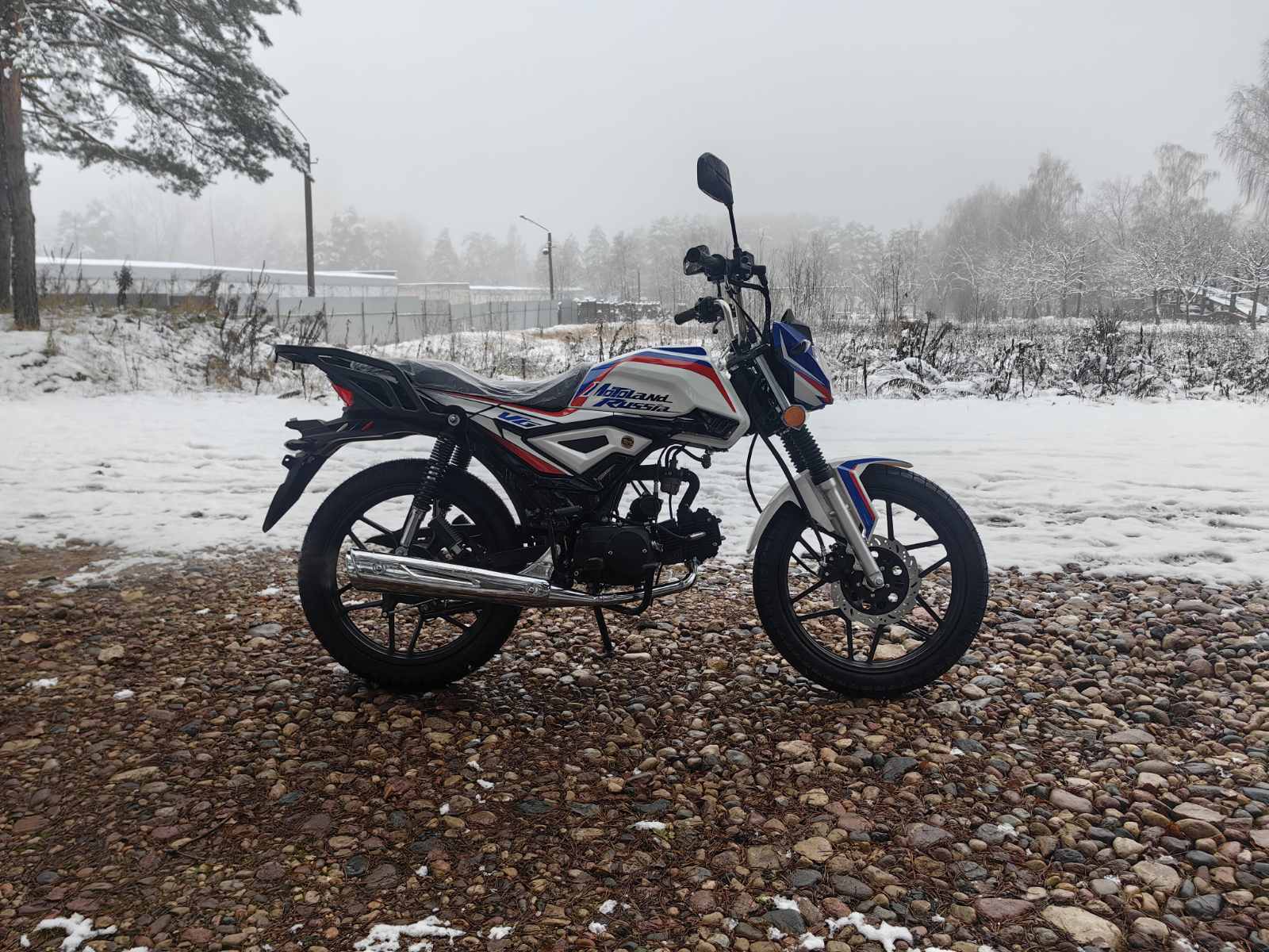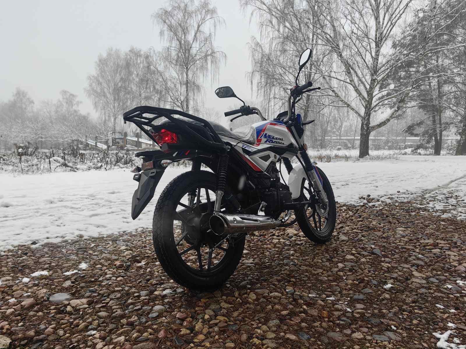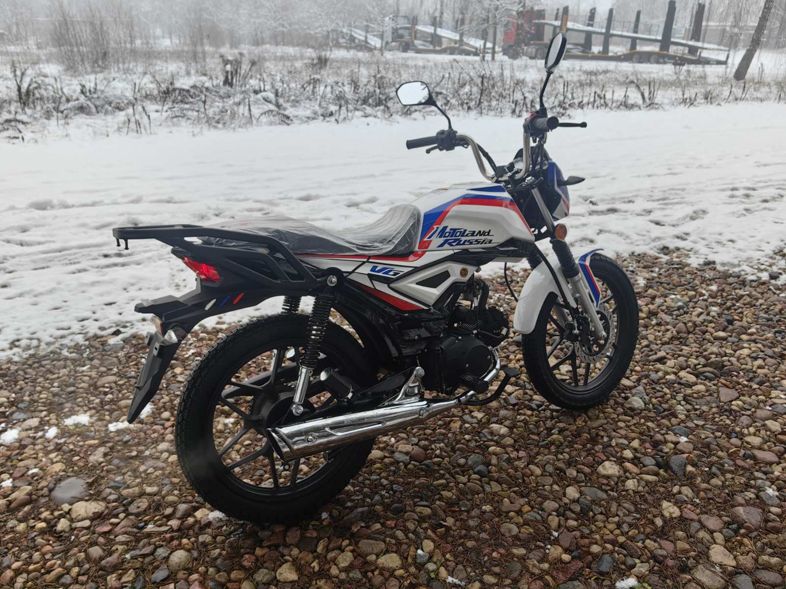 Колеса у мопеда Motoland Альфа VG 11 на литых дисках, 18 дюймов. Резина 2.75 спереди, 3.50 сзади. Это не скутерные 12-е и 13-е, а полноразмерные колеса. Они лучше держат колею, преодолевают ямы и не проваливаются в грунт.
