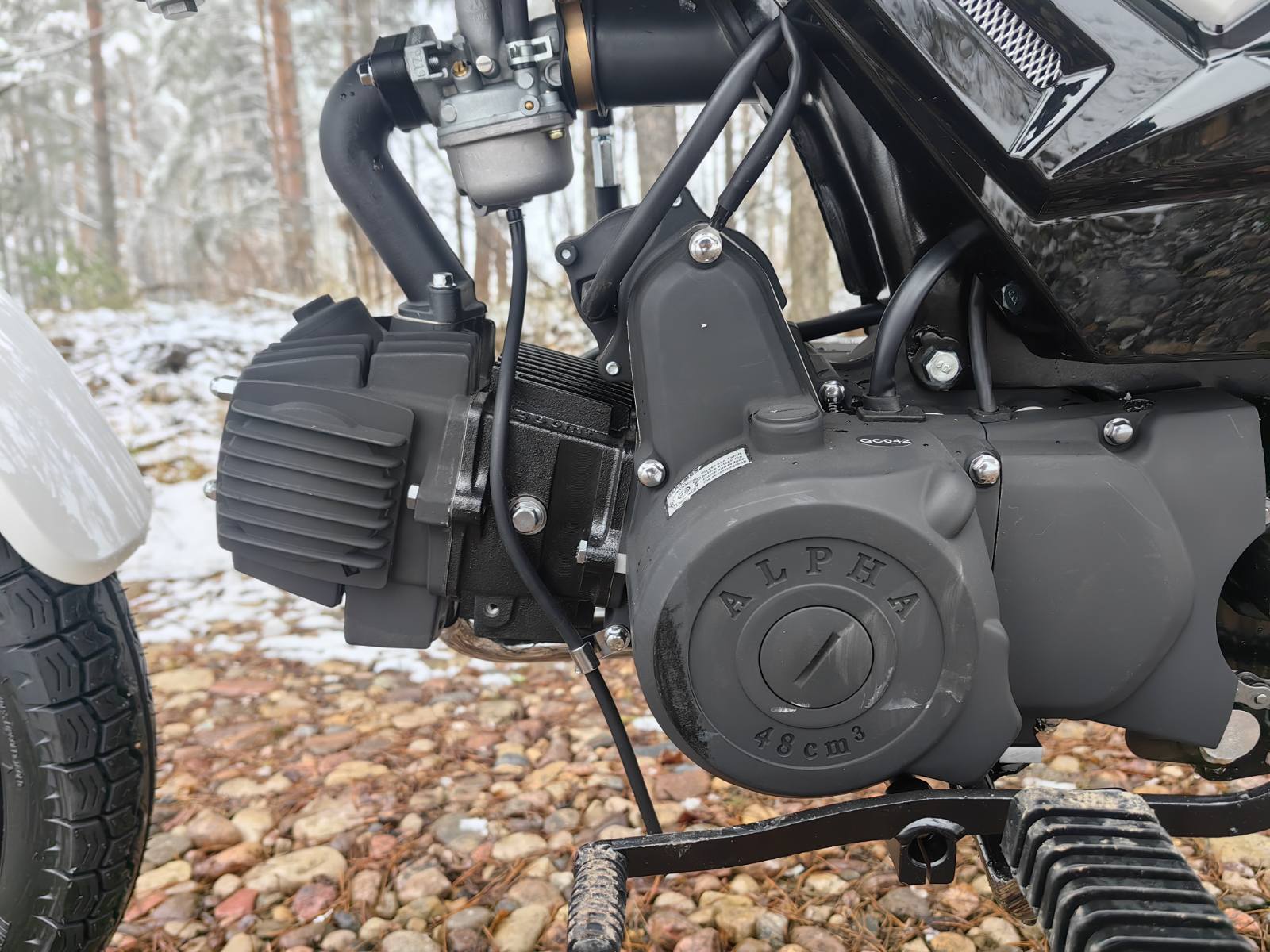 У мопеда одноцилиндровый 4-тактный двигатель 1P39FMB с воздушным охлаждением. По документам его объем 50 кубов, реально — 110 см³. Мощность в 5 лошадиных сил не впечатляет, пока не начинаешь считать. Мопед легко везет двух человек, забирается в горку и не тупит в потоке. Карбюратор Keima PZ19 настроен на работу с любым бензином. Если залить 92-й сомнительного происхождения — поедет. Если мопед простоял полгода в гараже — заведется.