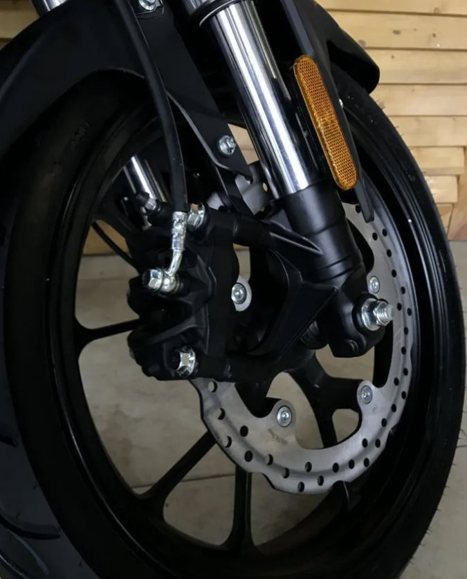 - Тормоза: передние — усиленные двухпоршневые, обеспечивают эффективное торможение