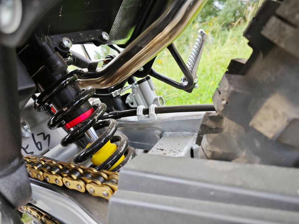 - Задняя подвеска: маятниковый рычаг с прогрессией и моноамортизатором, высоту которого можно регулировать под рост райдера.