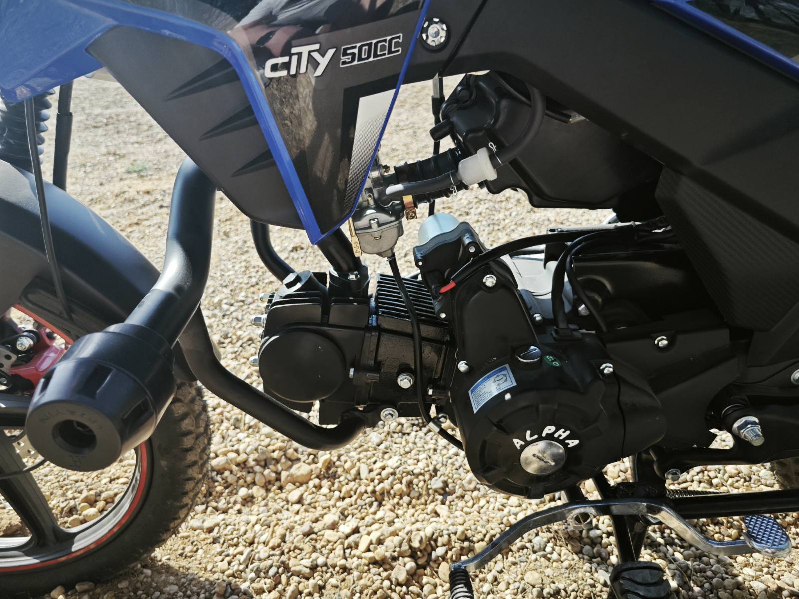 Надежный четырехтактный мотор объемом 49 см³, основанный на двигателе ROCKOT ALPHA CITY, славится своей долговечностью и простотой обслуживания. В комплект входит тюнинг-комплект для увеличения объема до 125 см³, который устанавливается без замены коленчатого вала.