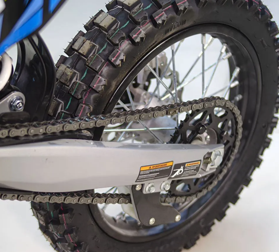 - Шины: Кроссовые грязевые с протектором 70/100-17 спереди и 90/100-14 сзади — обеспечивают отличное сцепление и управляемость на бездорожье