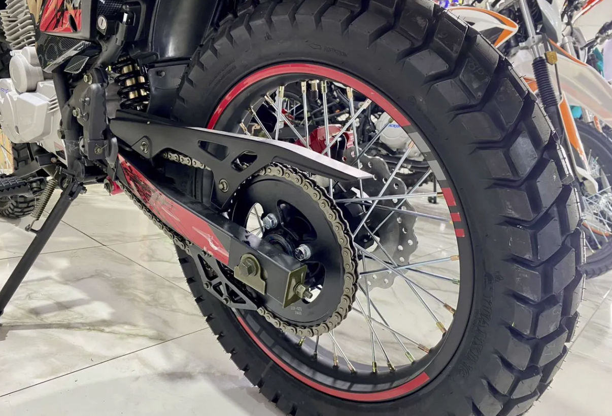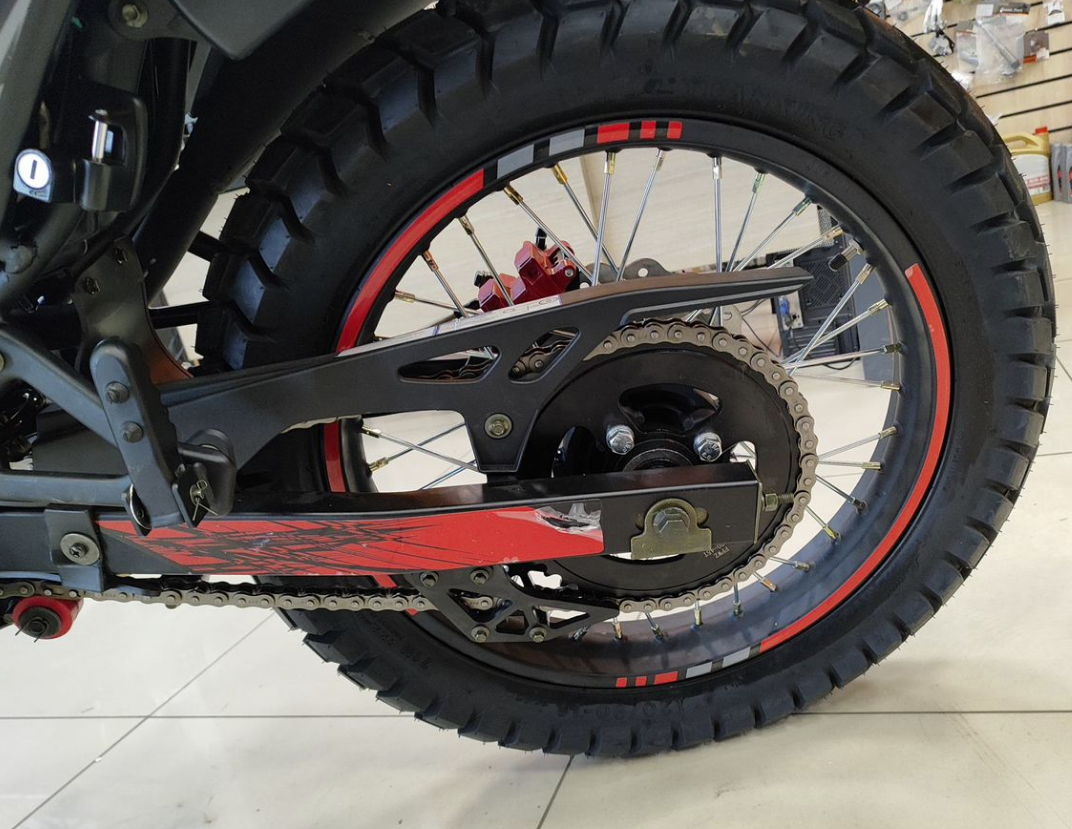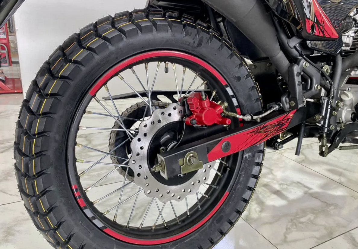 - Колеса: стальные диски диаметром 21/18 дюймов с вседорожными шинами 90/100-21 и 120/90-18 — отличное сцепление как на асфальте, так и на грунте.