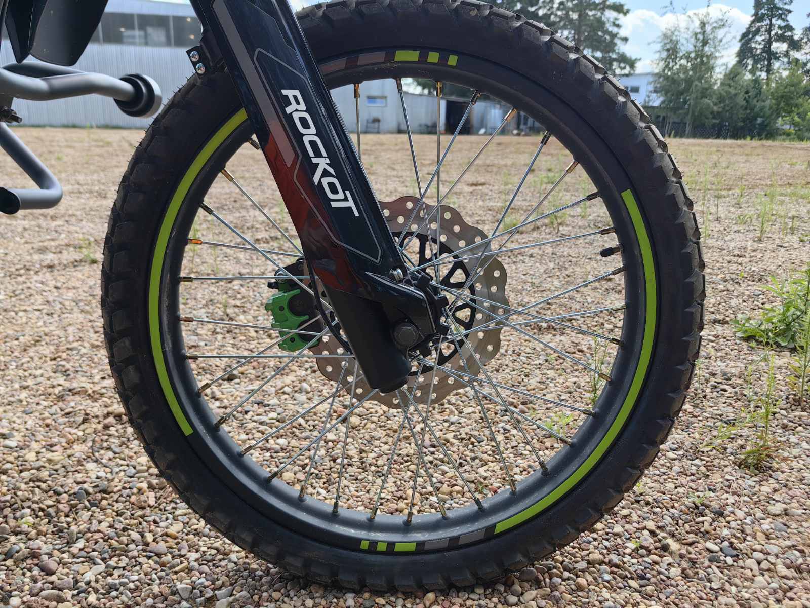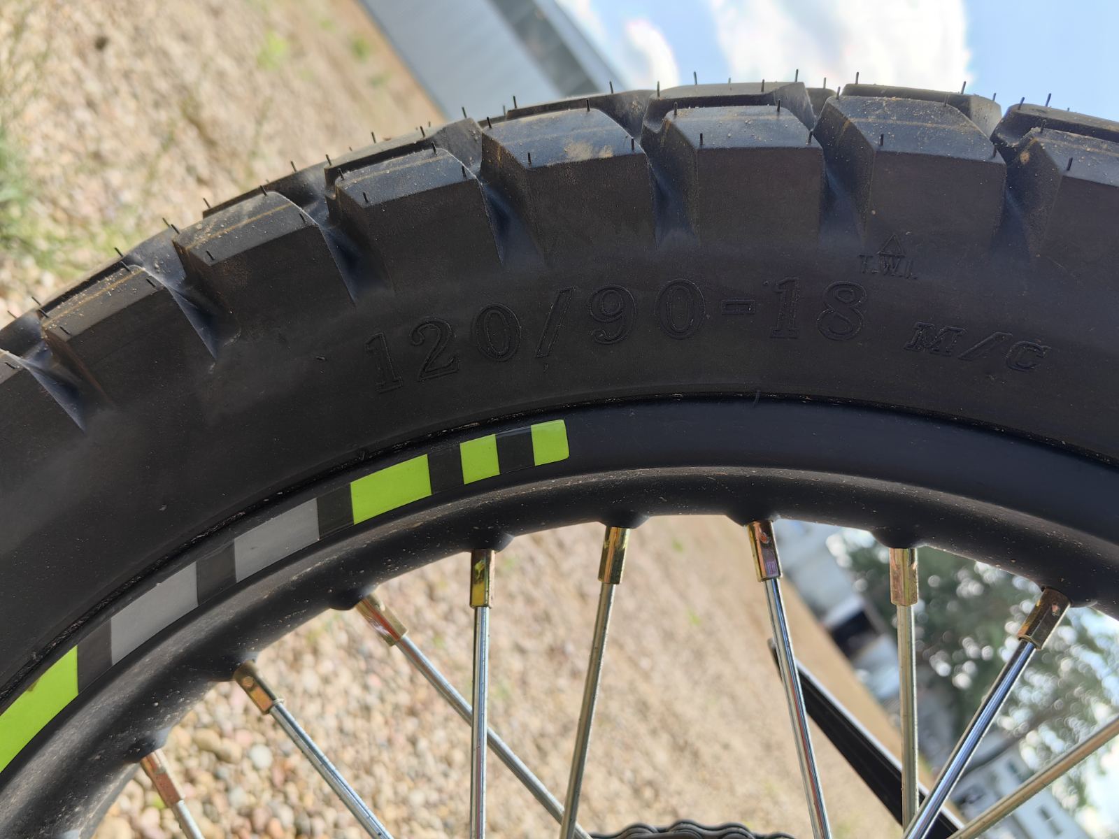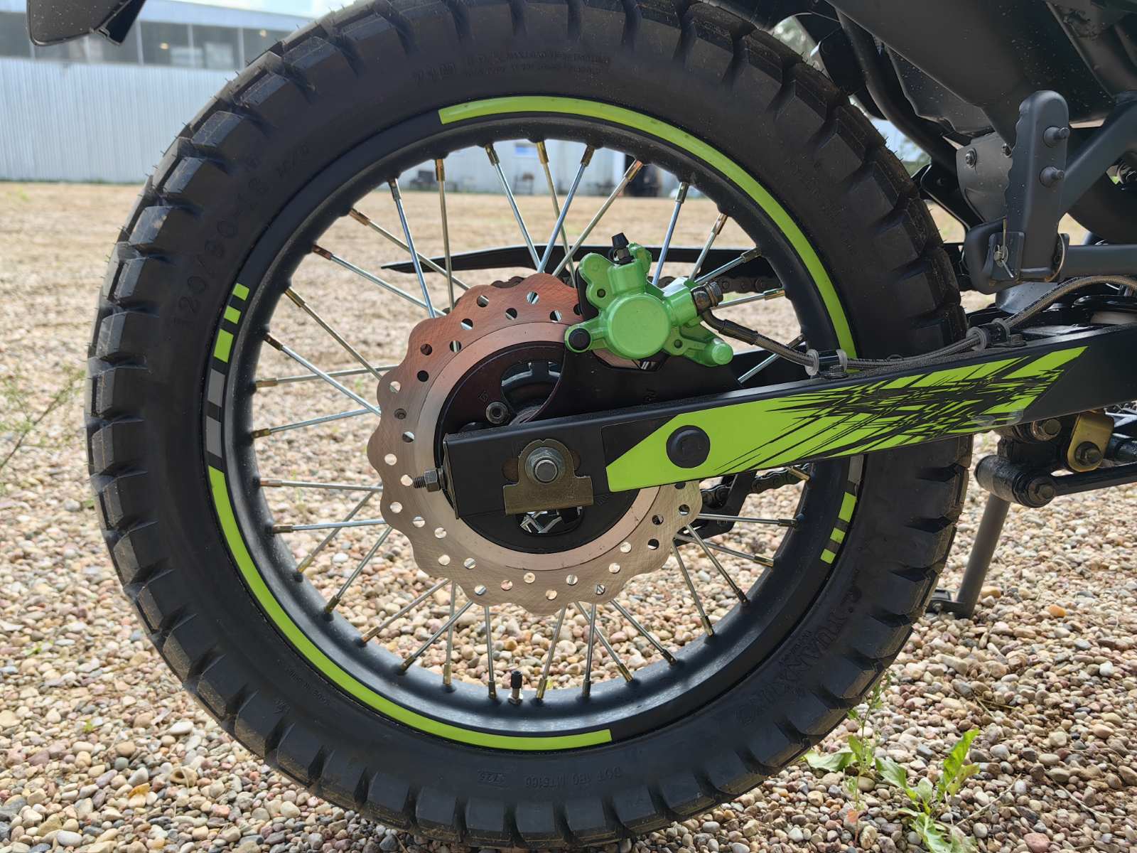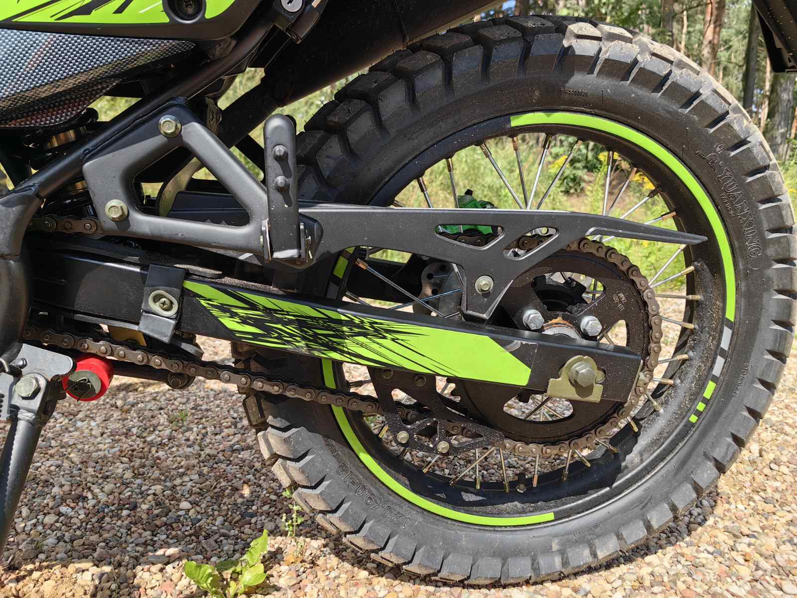 - Колеса: стальные диски диаметром 21/18 дюймов с вседорожными шинами 90/100-21 и 120/90-18 — отличное сцепление как на асфальте, так и на грунте.