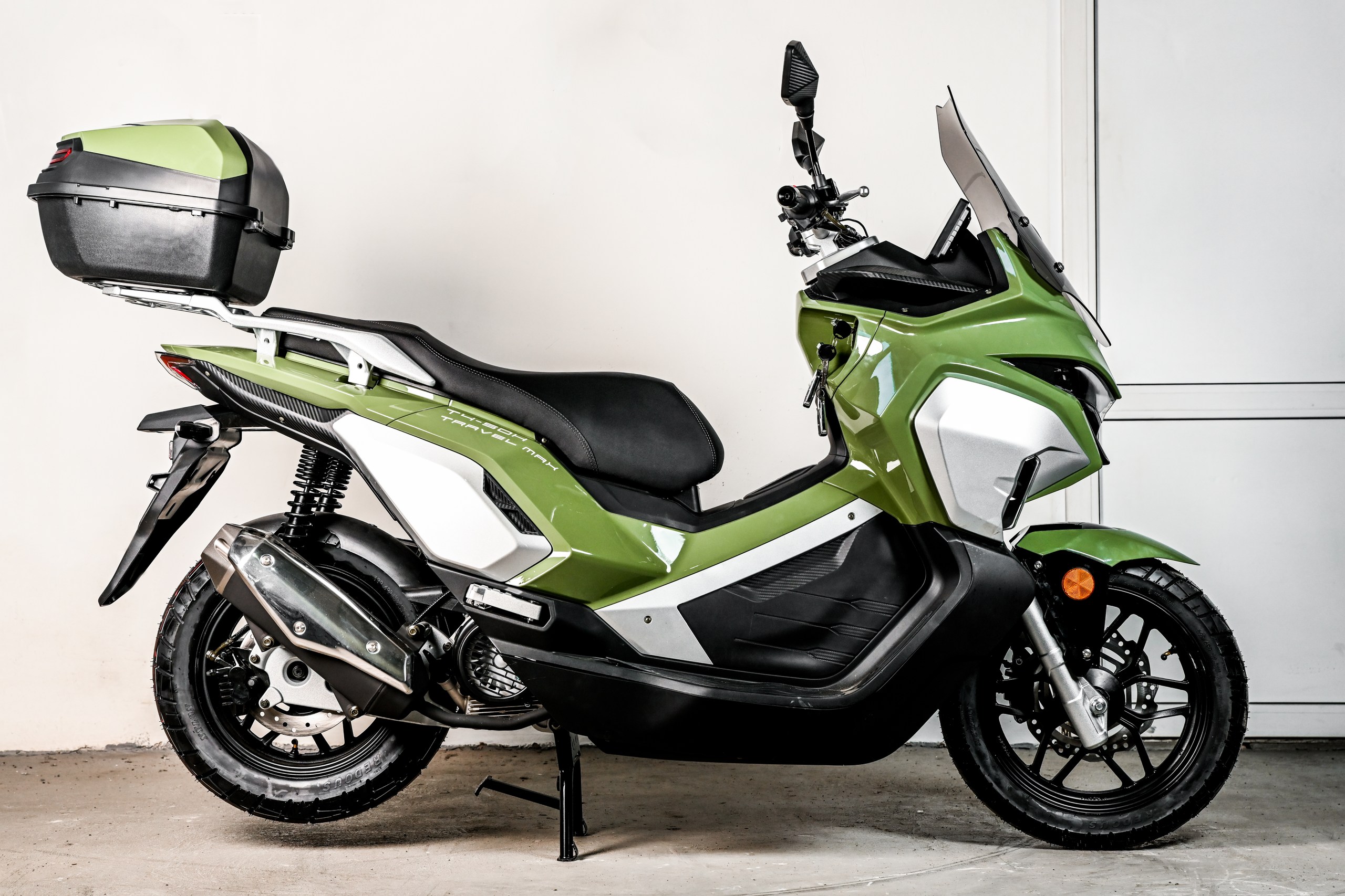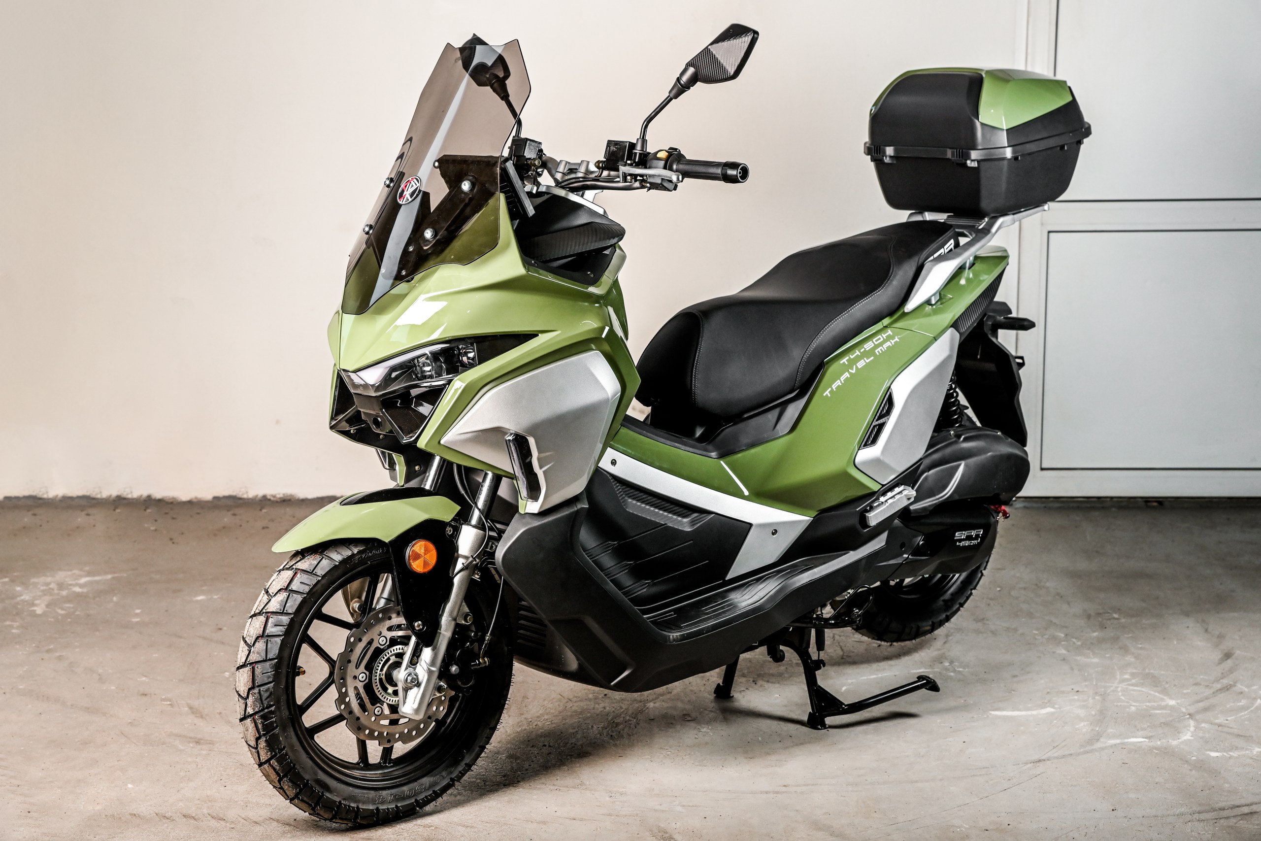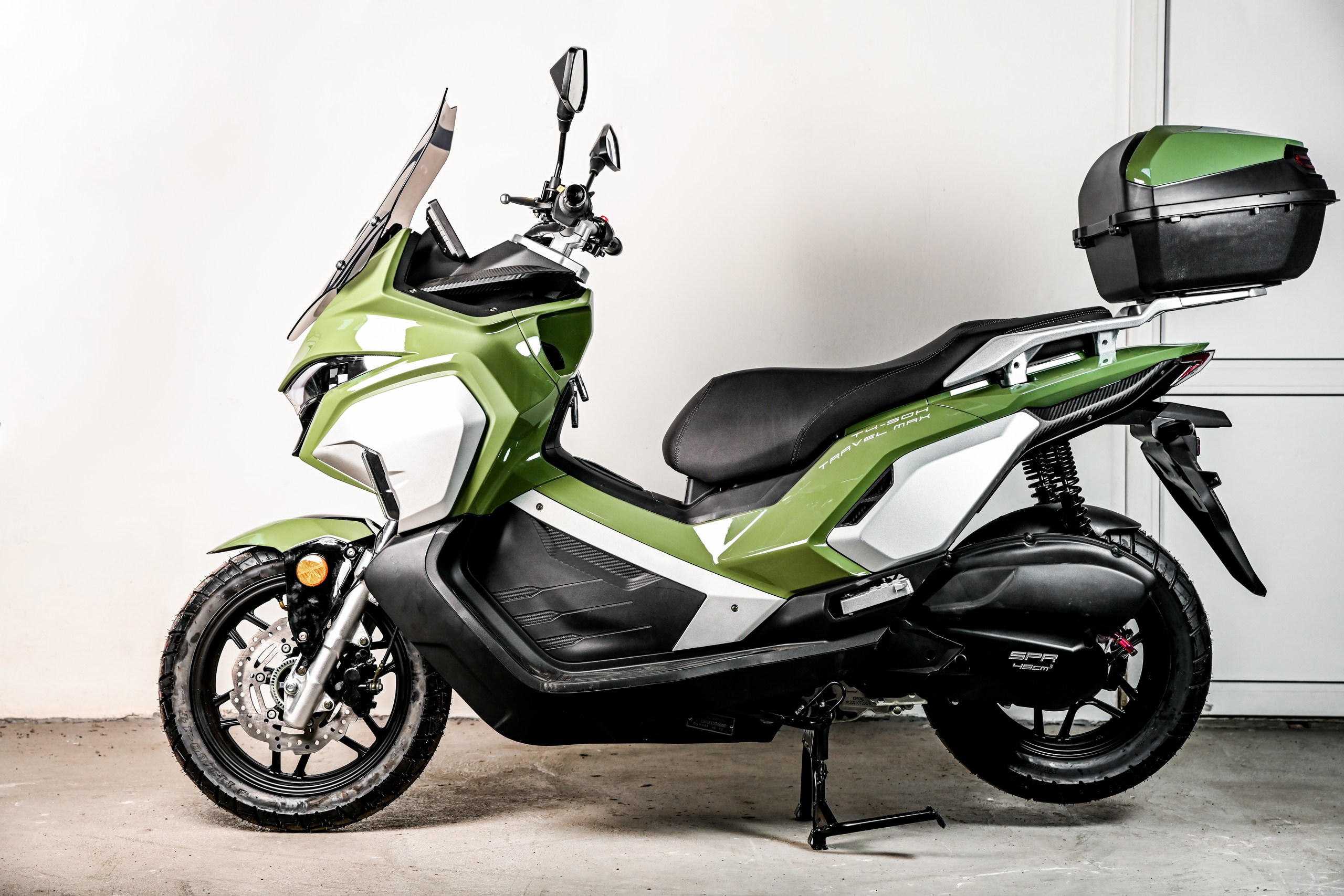 SPRMOTORS TRAVEL MAX T4-50H — это полностью укомплектованный туристический комплект. В базовой комплектации уже установлены вместительные боковые кофры и топ-кейс, что избавляет вас от лишних трат и поисков аксессуаров. Сердцем этого туриста стал надежный 180-кубовый инжекторный двигатель (EFI), который легко раскручивает скутер до 110 км/ч, оставаясь при этом удивительно экономичным (всего 2.8 л/100 км). Идеален для загородных поездок, ежедневных прогулок и уверенных путешествий по трассе.